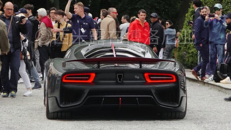 As we can see, the Hongqi S9’s exterior differs from the prototype shown in 2022. It is finished in black color and has some chrome trim all around the body. We should also mention that the S9 has a red line that crosses the bonnet. It is a signature design feature of all the Hongqi cars that was initially used on the legendary Hongqi CA770. Back to the S9, it has a single windshield wiper and trapeze-shaped headlights. It also got some huge air intakes in the front bumper, doors, fenders, and the rear bumper. It also has a huge rear spoiler and an aggressive diffuser.
