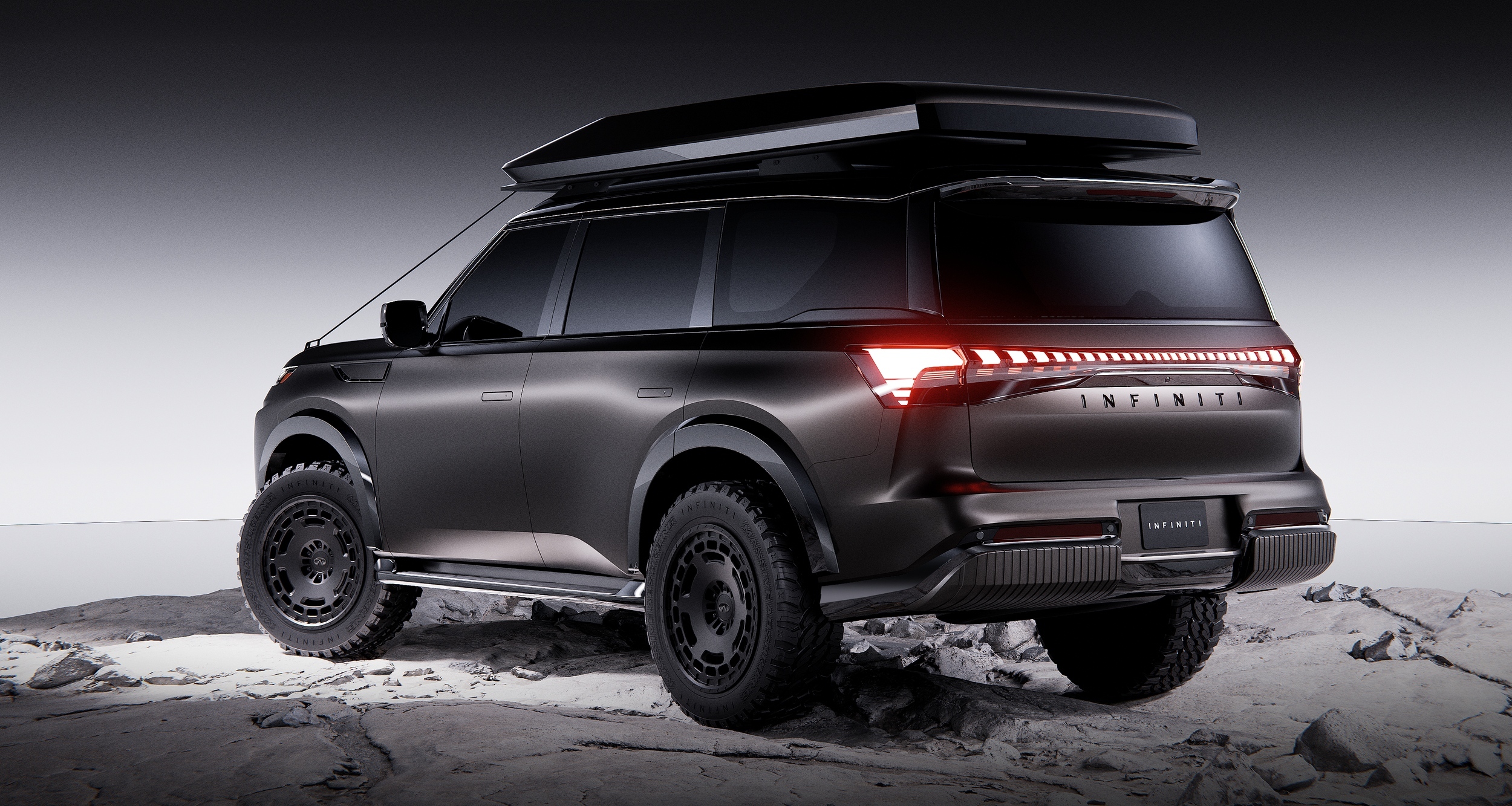 Infiniti was coy on specifics, but the concept has front and rear skid plates as well as an increased ride height. We can also see bulging fender flares and rugged wheels wrapped in all-terrain tires.
